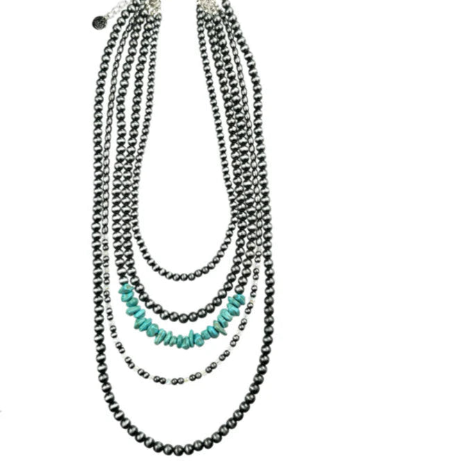 Elevate your style with this expertly crafted 5-strand necklace featuring a faux Pearl round beads that capture a refined western aesthetic. Two strands incorporate faceted crystal and turquoise chips-dyed stone chip beads, adding texture and vibrant color contrast. The shortest strand measures approximately 16 inches and includes an extender chain for a customizable fit, making this piece as versatile as it is distinctive. Ideal for layering or standalone wear, it brings a sophisticated blend of rustic charm and polished detail.