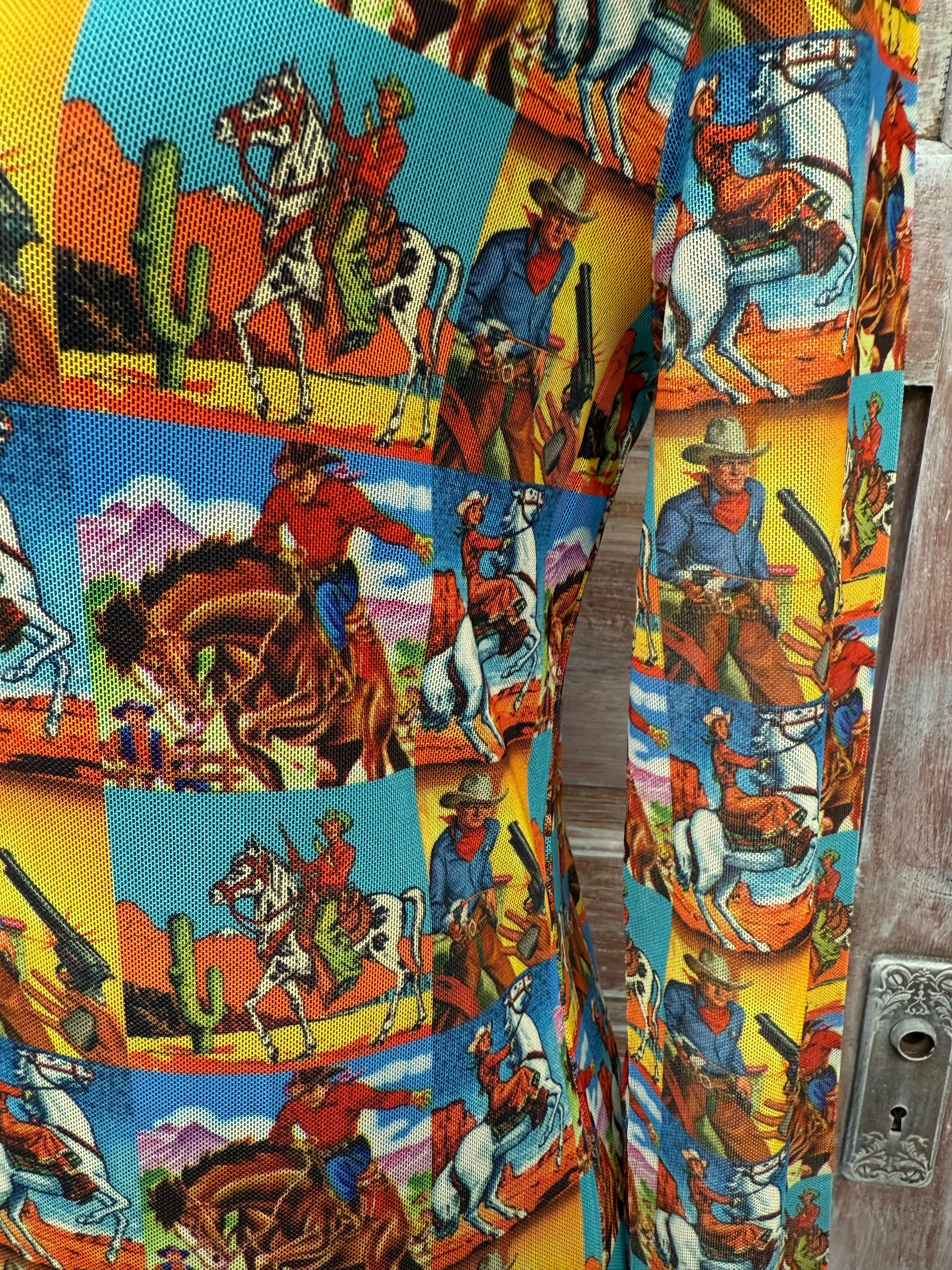 Retro Comic Cowboys Long Sleeve Mesh Top
