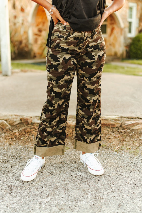 Step into bold Western Edge with our Camo-Wide-Leg pants, designed for the confident cowgirl who's not afraid to stand. Crafted from a durable cotton-blend twill. these high-rise pants feature a rugged camouflage print with a structured wide-leg silhouette and dramatic contrast cuff in solid khaki. The relaxed fit flatters all body types, while classic five-pocket styling adds function to fashion. Whether styled with boots or sneakers, these bottoms bring military-inspired Western charm to any boutique lineup. Ideal for mixing into Fall and transitional wardrobes,